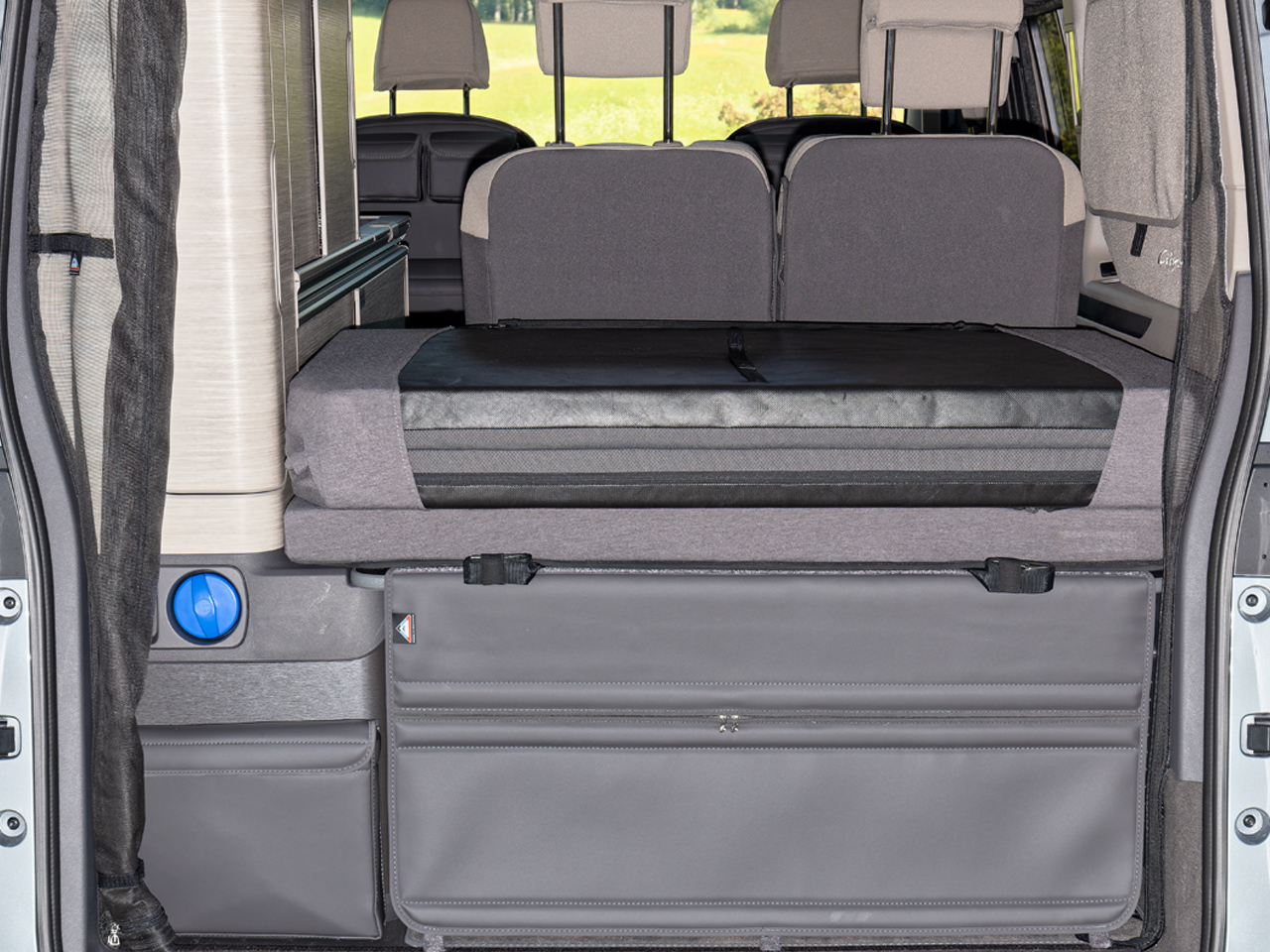 Die vorhandenen Befestigungsgurte für das VW-Faltbett können aufgerollt und mit den Gummibandschlaufen so befestigt werden, dass sie nicht stören und ansprechend aufgeräumt sind.